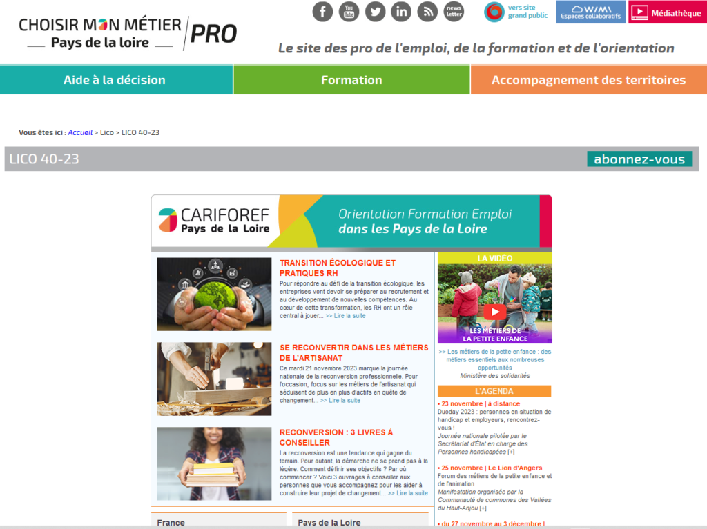 Accueil Mission 1 Mission 2 Mission 3 Titre Connaissance du territoire et veille socio-économique Sites internet Interlocuteurs Vidéos Ouvrages Outils Des sites internet à visiter pour connaitre son territoire Les Newsletters Des sites internet à visiter Lettre d'information hebdomadaire du Carif-Oref Veille juridique - Centre Inffo Newsletters régionales Newsletters de la CCI Politiques nationales Emploi, Formation, Orientation Formation professionnelle - Ministère du travail, du plein emploi et de l'insertion Emploi et insertion - Ministère du travail, du plein emploi et de l'insertion Etudes et articles sur les politiques - Céreq Politiques régionales Emploi, Formation, Orientation Région Pays de la Loire REPERES territoriaux - Choisir mon métier CLEFOP - Choisir mon métier DATA - Panorama pour le Territoire - Pôle emploi Pays de Loire Enquête annuelle sur le Besoin de Main d'Oeuvre (BMO) - Pôle emploi Observatoire de l'emploi - Pôle emploi L'offre régionale de formation - Région Pays de Loire SAFRAN Pays de la Loire - Situer et Analyser les Formations Régionales pour ANticiper Liste des opérateurs de compétences - Transition Pro Politiques locales Emploi, Formation, Orientation Insertion emploi - 44 Insertion emploi - 49 Insertion emploi - 53 Insertion emploi - 72 Insertion emploi - 85 Economie et territoire - CCI Pays de la Loire Les interlocuteurs privilégiés par territoire EFOP Présentation du rôle et missions des Délégués territoriaux orientation-emploi - Mme SOCHAS Marie-Christine Coordonnées des Délégués territoriaux orientation - emploi Vidéos Veille socio-économique Organiser et construire sa veille - Campus région du numérique - 2018 4 outils d'une veille stratégique - aa Académie - 2021 Les flux RSS expliqués Présentation des outils de diagnostic Professionnalisation des Conseillers relation entreprise - 2023 Repères : Présentation de l'outil du Cariforef des Pays de la Loire - Choisir mon métier Pays de la Loire Présentation de l'outil Safran - Choisir mon métier Pays de la Loire Webinaires Acteurs FPL Les acteurs de l'emploi, de la formation et de l'orientation professionnelle (EFOP) - 2024 - CAFOC de Nantes Les dispositifs d'accès à la formation - 2024 - CAFOC de Nantes La stratégie régionale emploi, formation et orientation professionnelles (SREFOP) - 2024 - CAFOC de Nantes Des articles ou des ouvrages à feuilleter Diagnostic territorial stratégique PDL post 2020 - Analyses AFOM Veille & Qualiopi : bonnes pratiques pour mettre en place une veille - Carif-Oref Occitanie - 2022 Catalogue du Programme Régional de formation professionnelle continue - Région Pays de le Loire - Novembre 2023 Stratégie régionale de l'emploi, de la formation et de l'orientation professionnelles 2023-2028 des Pays de la Loire Des outils pour construire sa veille Google alertes Inoreader Plateforme globale de gestion de ressources - Netvibes Sauvegarde de ressources internet - Pocket Formulaire de recherche avancée - Google Outils et espace de travail collaboratif - Outil WIMI Flux RSS : comment les trouver ou les générer sur internet ? - Keep it simple Astuce de veilleur - Outils froids Retour au menu